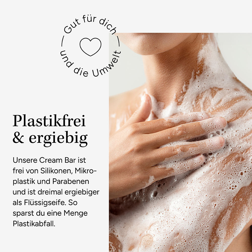 Unsere Cream Bar ist je nach Haarlänge und Anwendungsgewohnheit dreimal ergiebiger als Flüssigseife. Bei herkömmlichen Duschgels und Shampoos aus der Plastikflasche landet meist mehr als nötig auf Haut und Haaren. Feste Pflege wie unsere Cream Bar wird dagegen in der Hand aufgeschäumt und ist so sparsamer in der Anwendung. Zudem hat sie anstatt der üblichen drei Walzvorgänge, eine fünffache Walzung durchlaufen und ist damit besonders verdichtet und ergiebig.