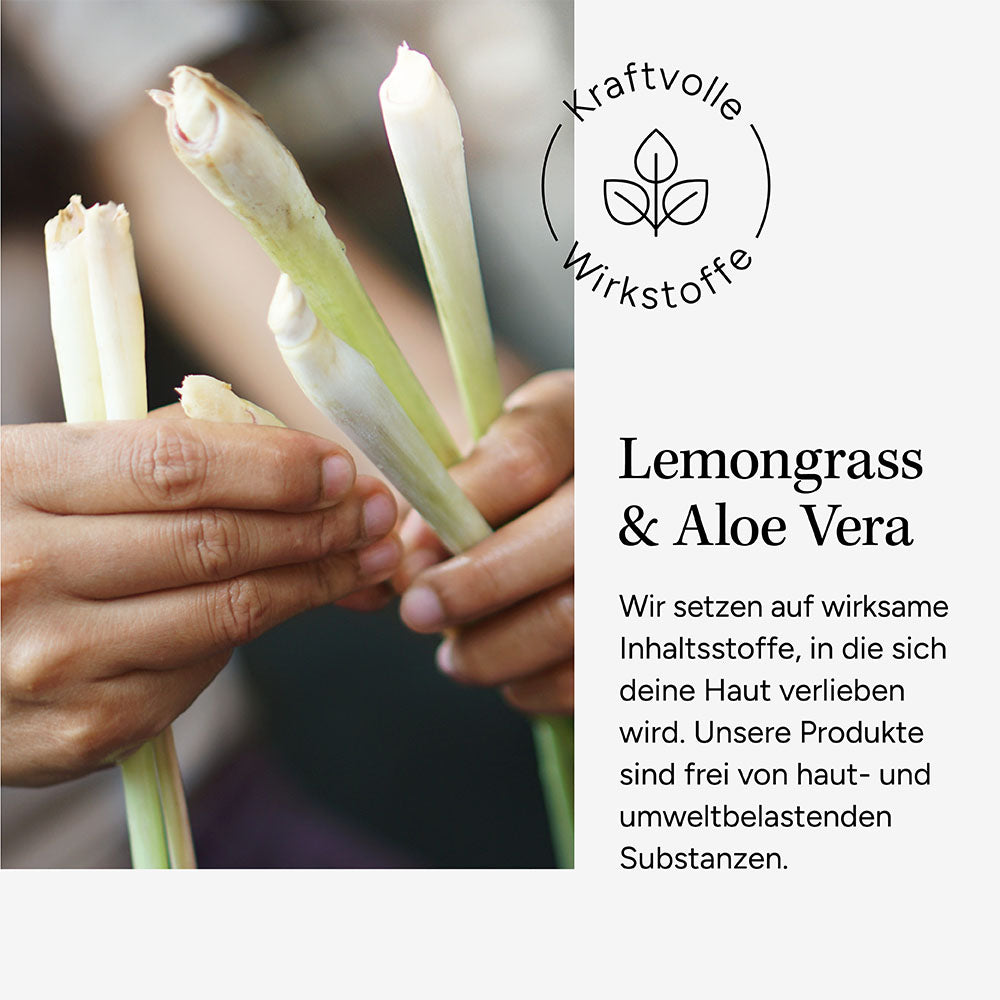 Unsere Cream Bar hat einen pH-Wert von 5,5 und reinigt Haut und Haare besonders sanft, ohne auszutrocknen. Der milde Schaum eignet sich zudem ideal als Gleitfilm für die Rasur. Vitalisierendes Lemongrass erfrischt Körper und Geist. Aloe Vera spendet Feuchtigkeit und verhindert, dass die Haut und Haare austrocknen.